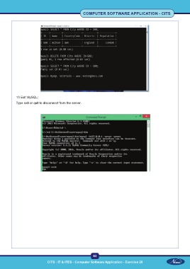 COMPUTER SOFTWARE APPLICATION - CITS 10 Exit MySQL: Type exit or quit to disconnect from the server. 63 CITS : IT & ITES - Computer Software Application - Exercise 20 CITS : IT & ITES - Computer Software Application - Exercise 20