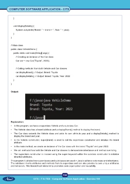 • We call methods from both the Vehicle and Car classes to demonstrate inheritance and method overriding.