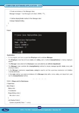• In the main method, we create an instance of the Manager class with a name, salary, and department, and