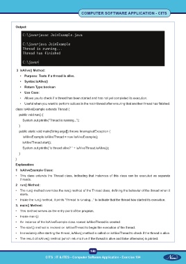 • The result of isAlive() method (which returns true if the thread is alive and false otherwise) is printed.