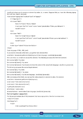 JavaScript allows you to access an element by index, id, or name. Suppose that you have the following signup