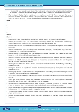 • Exception Handling: Be prepared to handle exceptions like InputMismatchException or NoSuchElementException