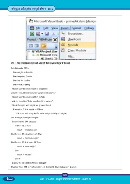 MsgBox “Your BMI is: “ &Round(bmi, 2) &vbCrLf& “BMI Category: “ & result