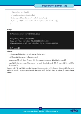 • main() िविध म , सक ल ास का एक ऑ े myCircle बनाया जाता है, और सक ल के े और प रिध की गणना करने के िलए इसकी िविधयों