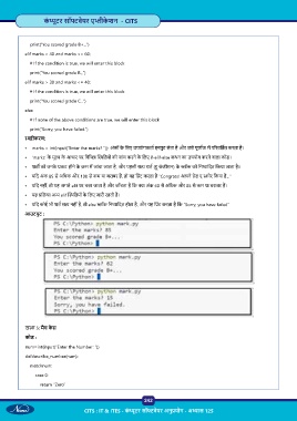 • marks = int(input(“Enter the marks? “)): अंकों के िलए उपयोगकता इनपुट लेता है और उसे पूणा क म प रवित त करता है।