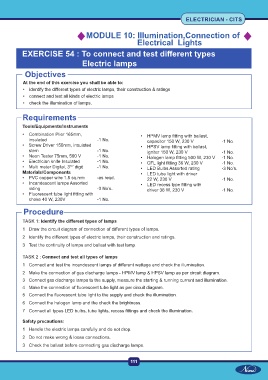 • Electrician knife Insulated -1 No. • CFL light fitting 36 W, 230 V -1 No.