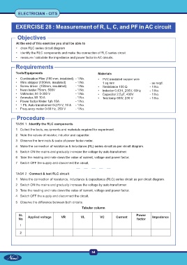 EXERCISE 28 : Measurement of R, L, C, and PF in AC circuit