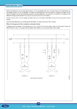 When the alternators are synchronized, lamps 1 and 2 are bright and lamp 3 is dark. Since two of the lamps are