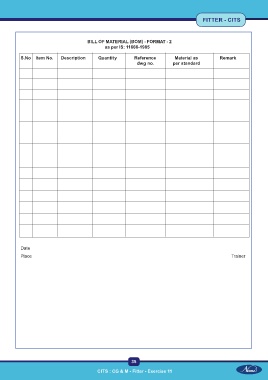 FITTER - CITS BILL OF MATERIAL (BOM) - FORMAT - 2 as per IS: 11666-1985 S.No Item No. Description Quantity Reference Material as Remark dwg no. per standard Date Date: Place Trainer Place: Trainer 35 CITS : CG & M - Fitter - Exercise 11