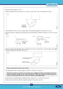 Hold the drill level. Twist it until one cutting edge is horizontal and parallel to the wheel face. (Fig 3)