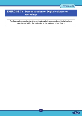 FITTER - CITS EXERCISE 78 : Demonstration on Digital calipers on workshop The Demo of measuring the internal / external distances using a Digital calipers may be carried by the instructor to the trainees in inch/mm . 111