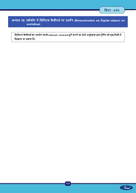 िफटर - CITS अ ास 78: वक शॉप म िडिजटल कै लीपस पर दश न (Demonstration on Digital calipers on workshop) िडिजटल कै लीपस का उपयोग करके internal / external द ू री मापने का डेमो अनुदेशक ारा ट ेिनंग को इंच/िममी म िदखाया जा सकता है। 111