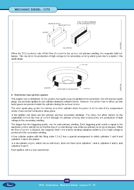 When the ECU suddenly cuts off the flow of current to the ignition coil primary winding, the magnetic field col-