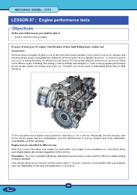 Purpose of testing an IC engine. Classification of test, fault finding tests, routine test