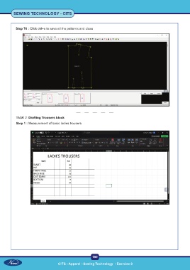 SEWING TECHNOLOGY - CITS Step 76 : Click ctrl+s to save all the patterns and close TASK 2: Drafting Trousers block Step 1 : Measurement of basic ladies trousers 180 CITS : Apparel - Sewing Technology - Exercise 9