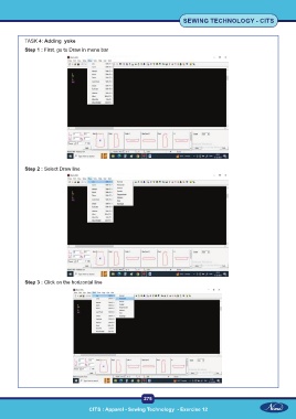 SEWING TECHNOLOGY - CITS TASK 4: Adding yoke Step 1 : First, go to Draw in menu bar Step 2 : Select Draw line Step 3 : Click on the horizontal line 275 CITS : Apparel - Sewing Technology - Exercise 12 CITS : Apparel - Sewing Technology - Exercise 12