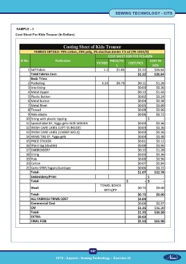 SEWING TECHNOLOGY - CITS SAMPLE - 3 Cost Sheet For Kids Trouser (In Dollars) 147 CITS : Apparel - Sewing Technology - Exercise 32 CITS : Apparel - Sewing Technology - Exercise 32