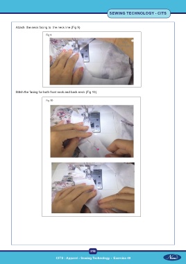 SEWING TECHNOLOGY - CITS Attach the neck facing to the neck line (Fig 9) Fig 9 Stitch the facing for both front neck and back neck (Fig 10) Fig 10 319 CITS : Apparel - Sewing Technology - Exercise 40 CITS : Apparel - Sewing Technology - Exercise 40