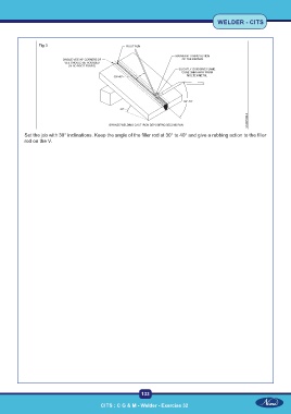 WELDER - CITS Fig 3 Set the job with 30° inclinations. Keep the angle of the filler rod at 30° to 40° and give a rubbing action to the filler rod on the V. 133 CITS : C G & M - Welder - Exercise 32 CITS : C G & M - Welder - Exercise 32