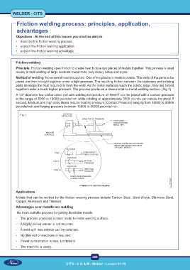 Principle: Friction welding uses friction to create heat to fuse two pieces of metals together. This process is used
